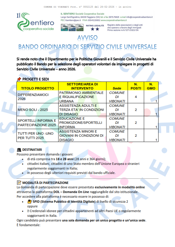 Documenti Bando ordinario di Servizio Civile Universale 2026 Servizio Civile Universale 2026 Caricamento…
