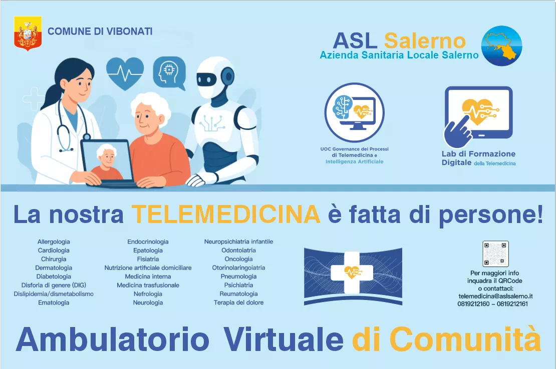 Pubblicata il - 15/04/2026 Apertura Ambulatorio Virtuale di Telemedicina in collaborazione con Asl Salerno Per informazioni e prenotazioni chiamare il numero 0973330716 attivo dal Lunedì al Venerdì dalle 09.00 alle 12.00